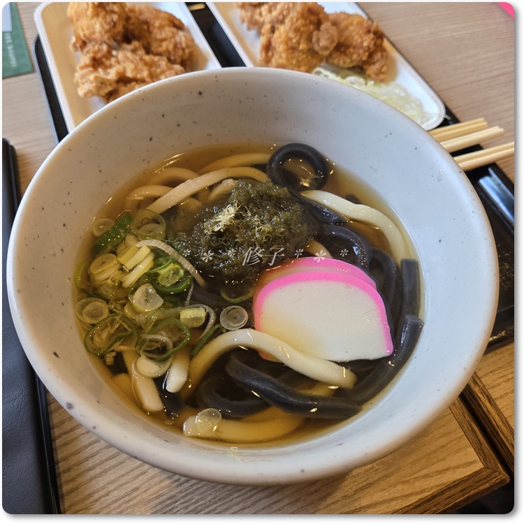 伊黒小芭内の羽織をイメージした2色のうどんに好物のとろろ昆布を盛り付けました。