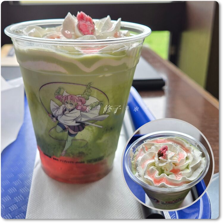 甘露寺蜜璃をイメージした桜ゼリーと抹茶ミルクに、塩漬けの桜をトッピングしました。春をぴったりなドリンクです。