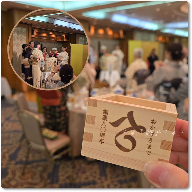 配られた80周年の升&鏡開きで乾杯!