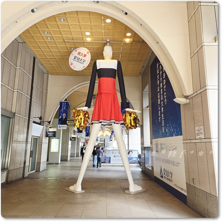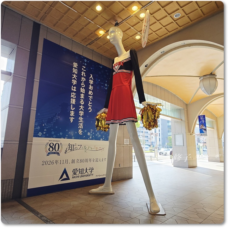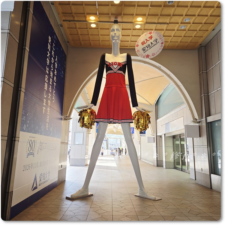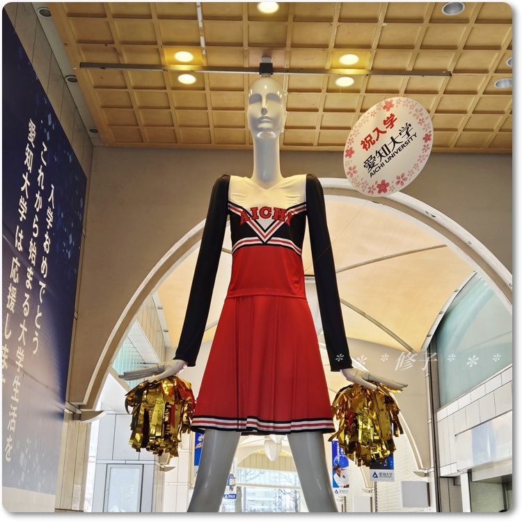 新入生にエールを送るというコンセプトで、愛知大学のチアリーダーのユニホームに着替えたナナちゃんなのですが、、、
