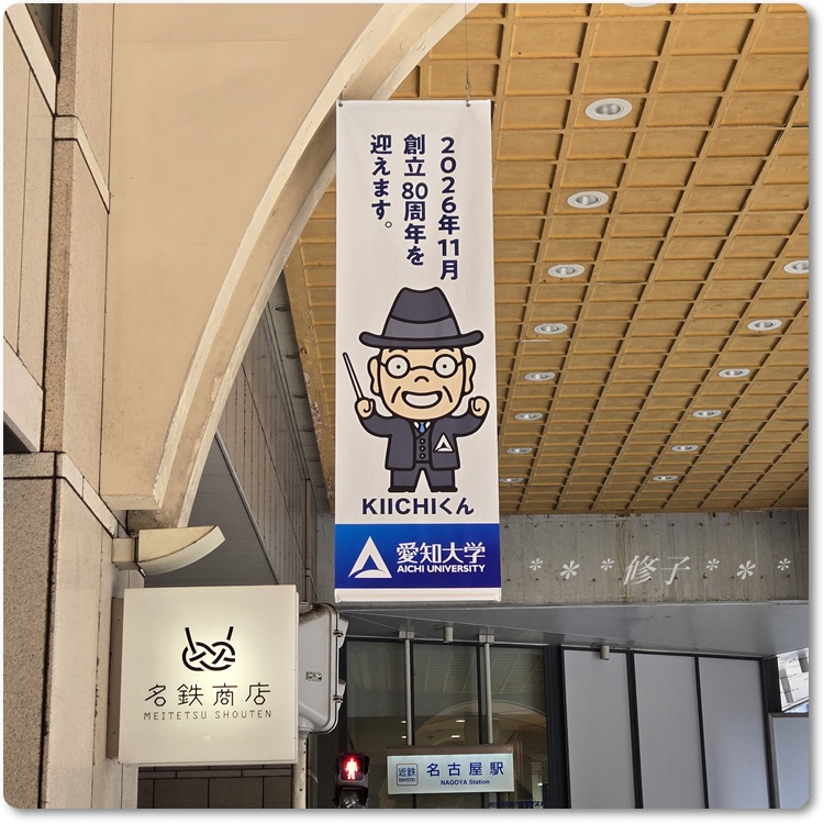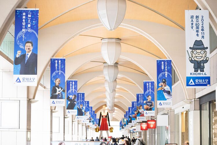 周囲のバナーには、クラブで活動している学生と学長のメッセージ、愛知大学公式マスコットキャラクター「KIICHIくん」が☆