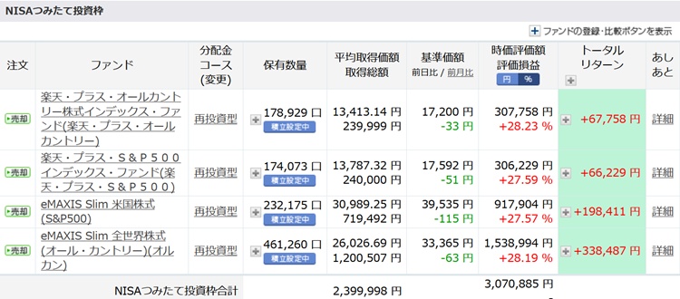 さらに、2年を通して楽天・プラスの成績がeMAXIS Slim並み(もしくは楽天の方が上)だったので、ポイントの付く楽天をちょっとだけ増やしてみました♪