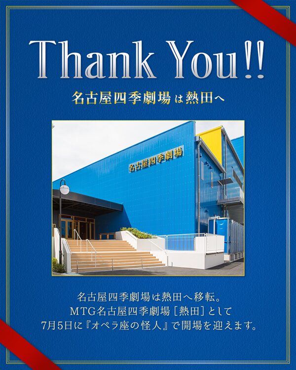「名古屋四季劇場は『マンマ・ミーア!』の上演を最後に名古屋市熱田区へ移転します。今後はMTG名古屋四季劇場に拠点を移し、7月5日よりミュージカル『オペラ座の怪人』を上演いたします。引き続き変わらぬご声援を賜りますよう、お願い申し上げます」と感謝を込めて伝えると、客席から一層大きな拍手が送られました。